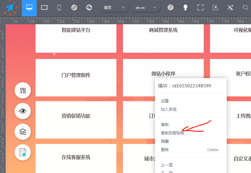 巅云V8增加跨页面复制模块功能了,支持一键复制模块到任意栏目,如下图: